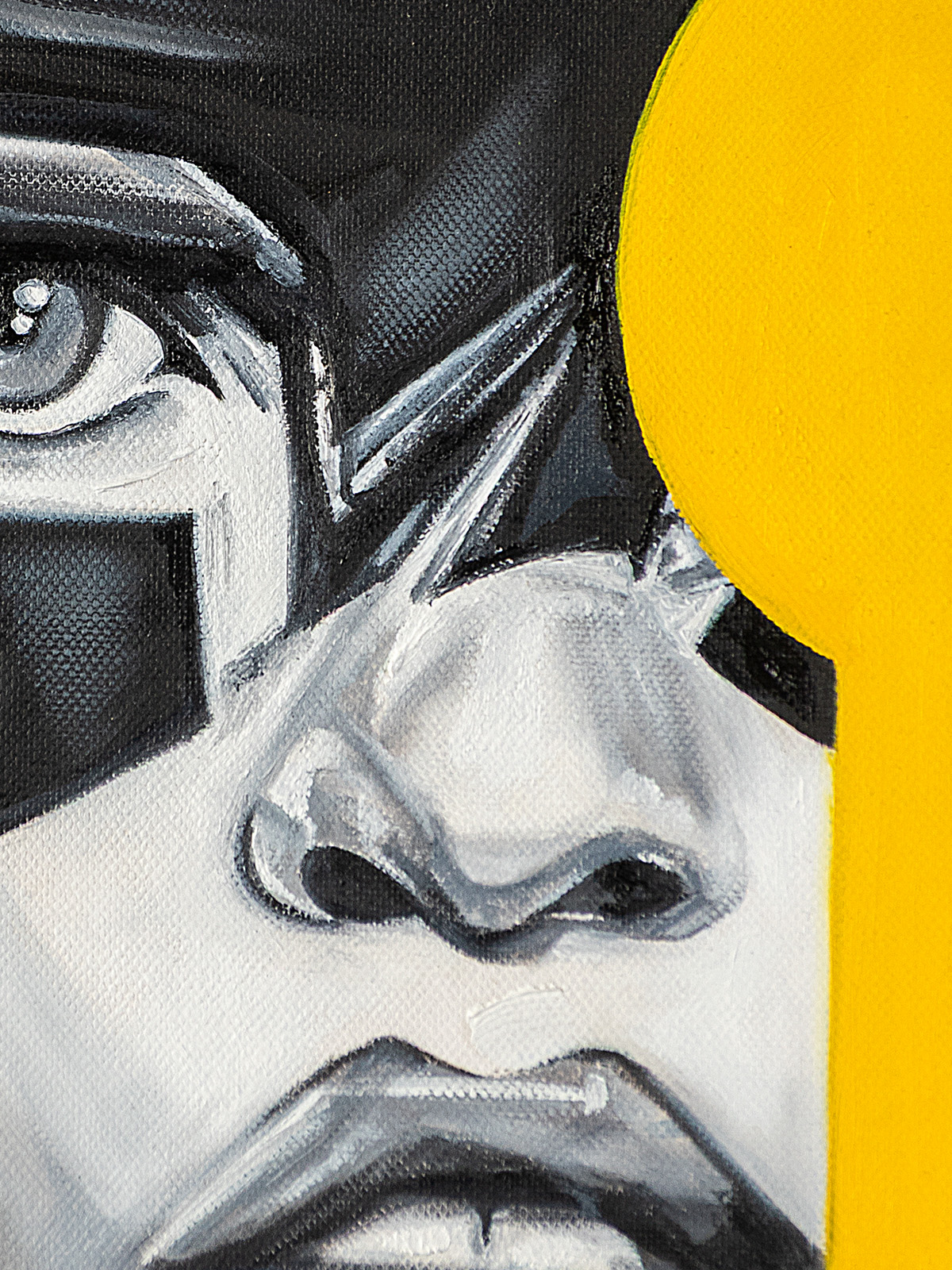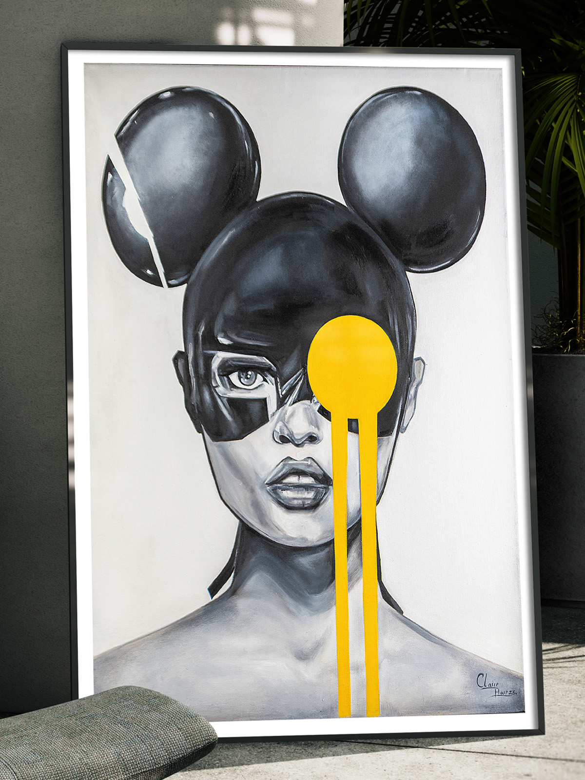 Pintura pop Art, “Mouse Girl”reinterpretación artística de Catwoman, fusionada con elementos icónicos de Mickey Mouse, creando un diálogo visual entre la cultura pop, el arte urbano y el arte conceptual moderno. El retrato femenino incorpora la composición combina arte figurativo y lenguaje abstracto, creando una pieza de alto impacto estético que dialoga con el diseño contemporáneo, el arte conceptual y la cultura.