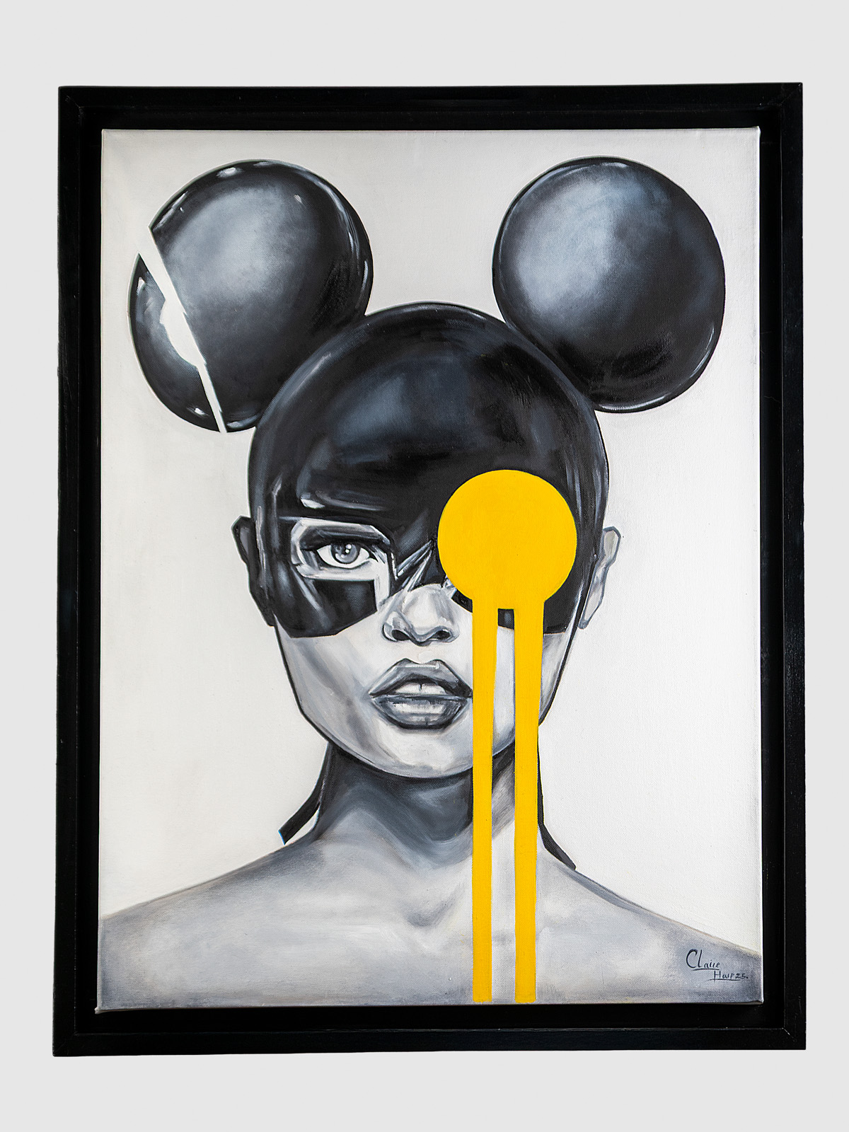 Pintura de “Mouse Gril” fusiona la reinterpretación artística evocativa de Catwoman, usando elementos icónicos de Mickey Mouse, creando un diálogo visual entre la cultura pop, el arte urbano y el arte conceptual moderno. El retrato femenino incorpora una máscara negra estilizada  que evocan la silueta de ratóny, resignificadas desde una estética oscura, elegante y provocadora.