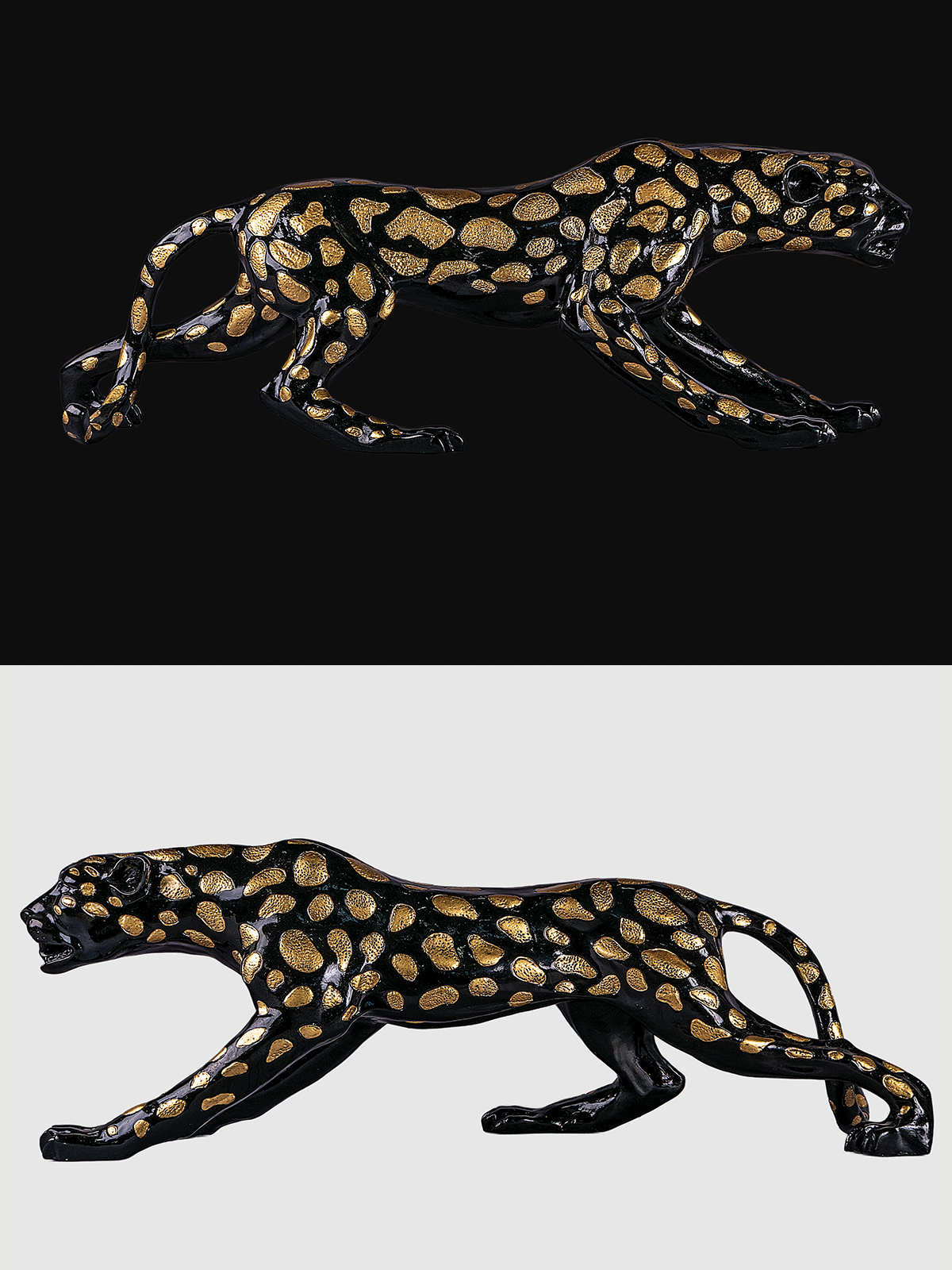 Escultura de jaguar  “Aurum Cheeta” perteneciente a la Línea Aurum, un tributo al jaguar como animal de poder ancestral, guardián de la noche y símbolo absoluto de fuerza, dominio y energía vital. Esta obra encarna la dualidad sagrada entre el negro profundo de la noche, asociado al misterio, la protección y lo invisible, y el dorado del sol, emblema de poder, abundancia y trascendencia.