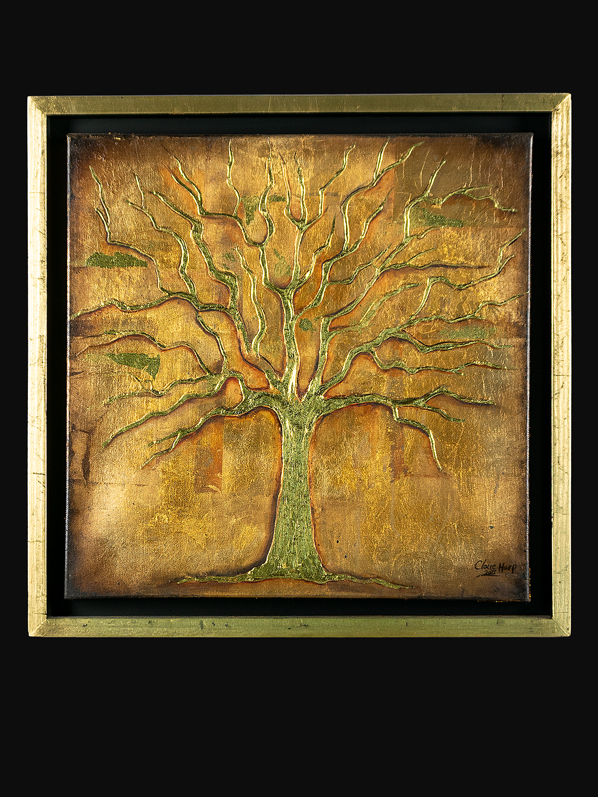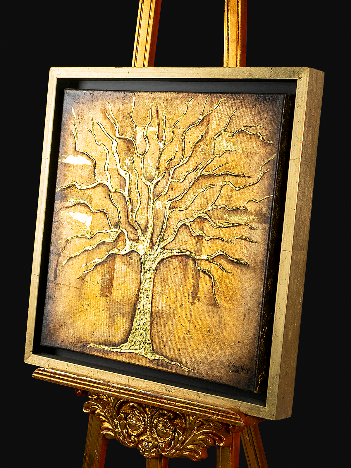 Pintura de árbol en oro representa la transición, la resiliencia y la fuerza interior, simbolizando la conexión entre la tierra y lo espiritual. Esta obra esta realizadaen relieve, donde las texturas doradas realzan cada detalle, aportando profundidad, elegancia y presencia visual.