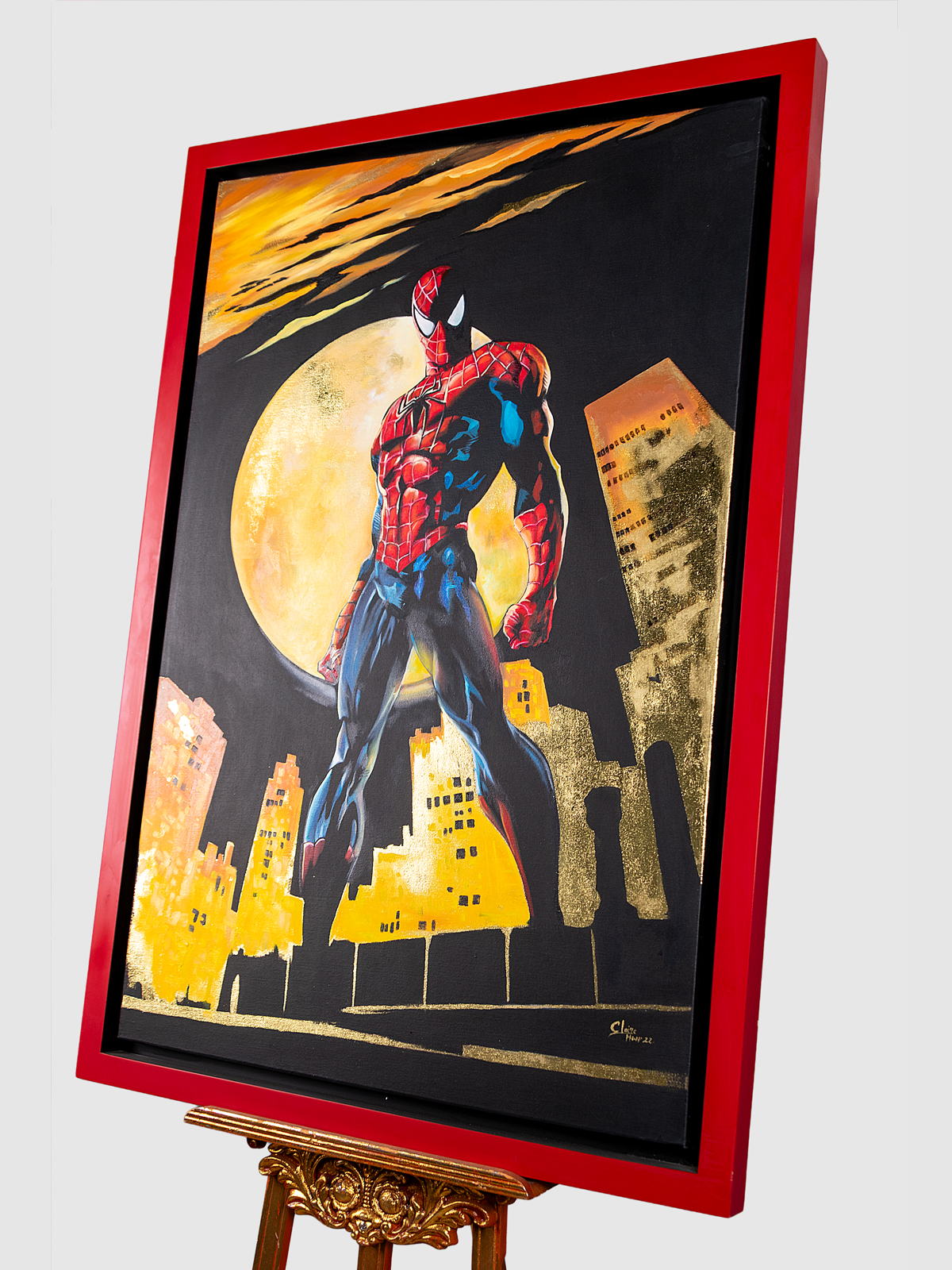 Pintura de Arácnido Pop art “Tejedor Nocturno”. inspirada en un héroe arácnido urbano, símbolo de valentía, agilidad y justicia contemporánea. La obra fusiona energía visual, contrastes intensos y estética gráfica moderna.