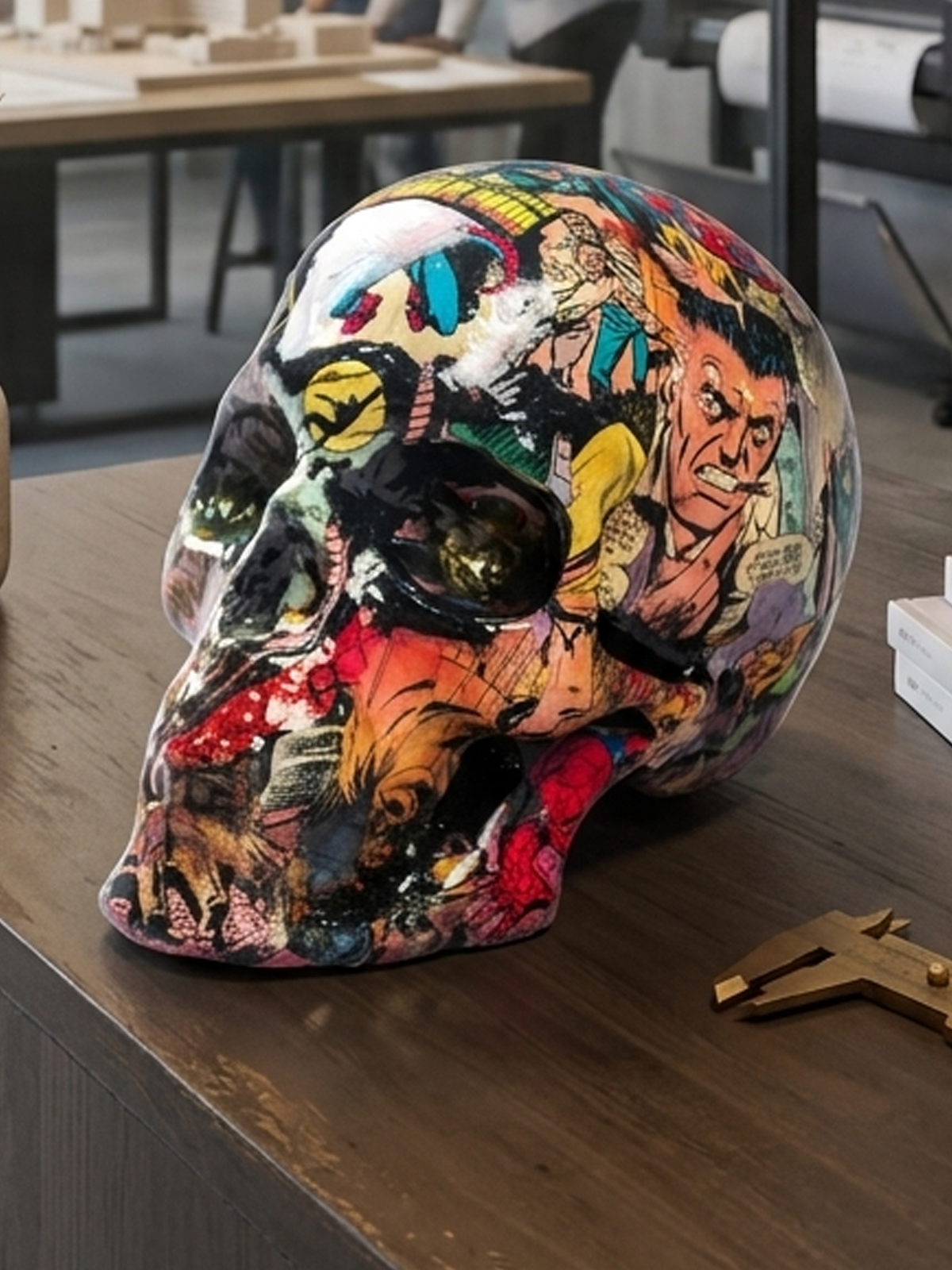 Escultura de craneo y comics