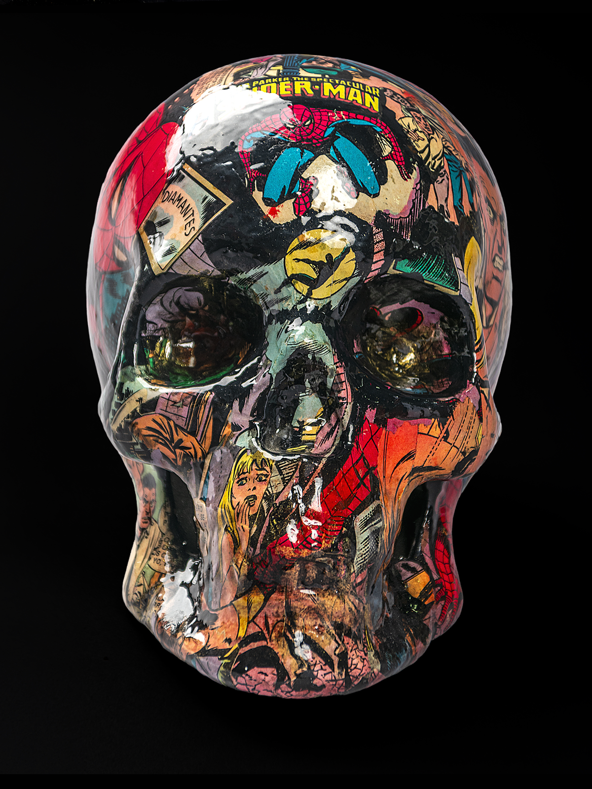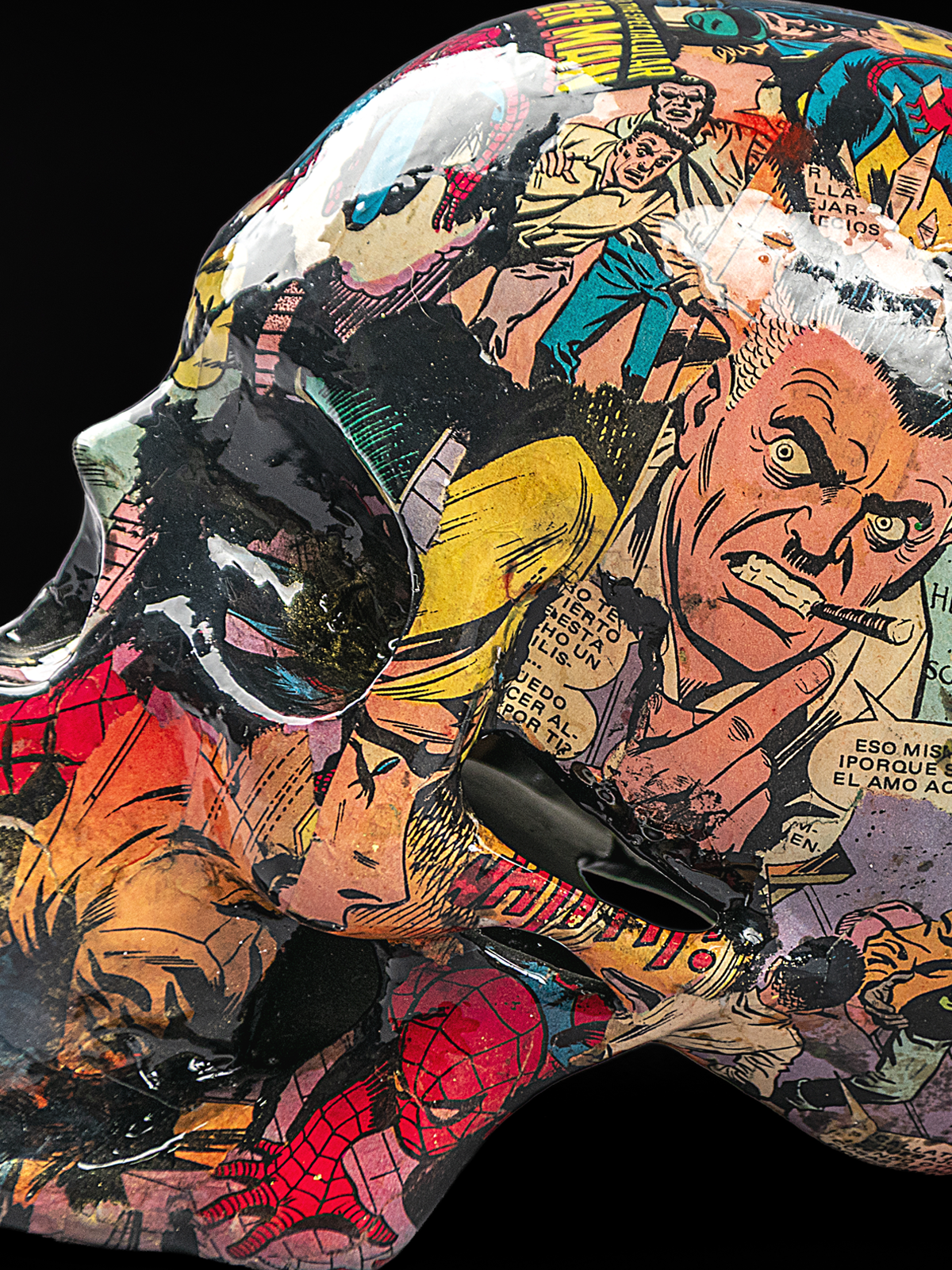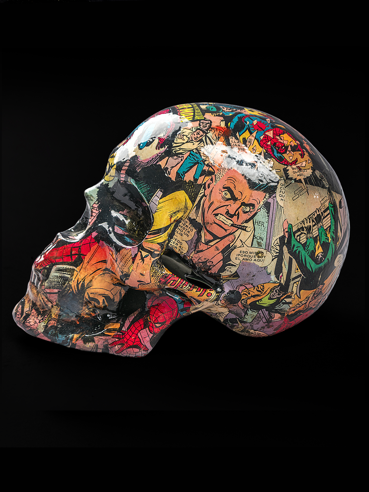 Escultura de cráneo contemporáneo “Craneo del tejedor” , intervenido con collage de cómic, que integra un soporte para una narrativa visual compleja. Mediante una técnica de collage (decoupage) con fragmentos de historietas.