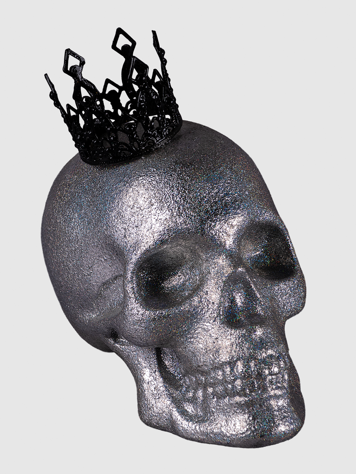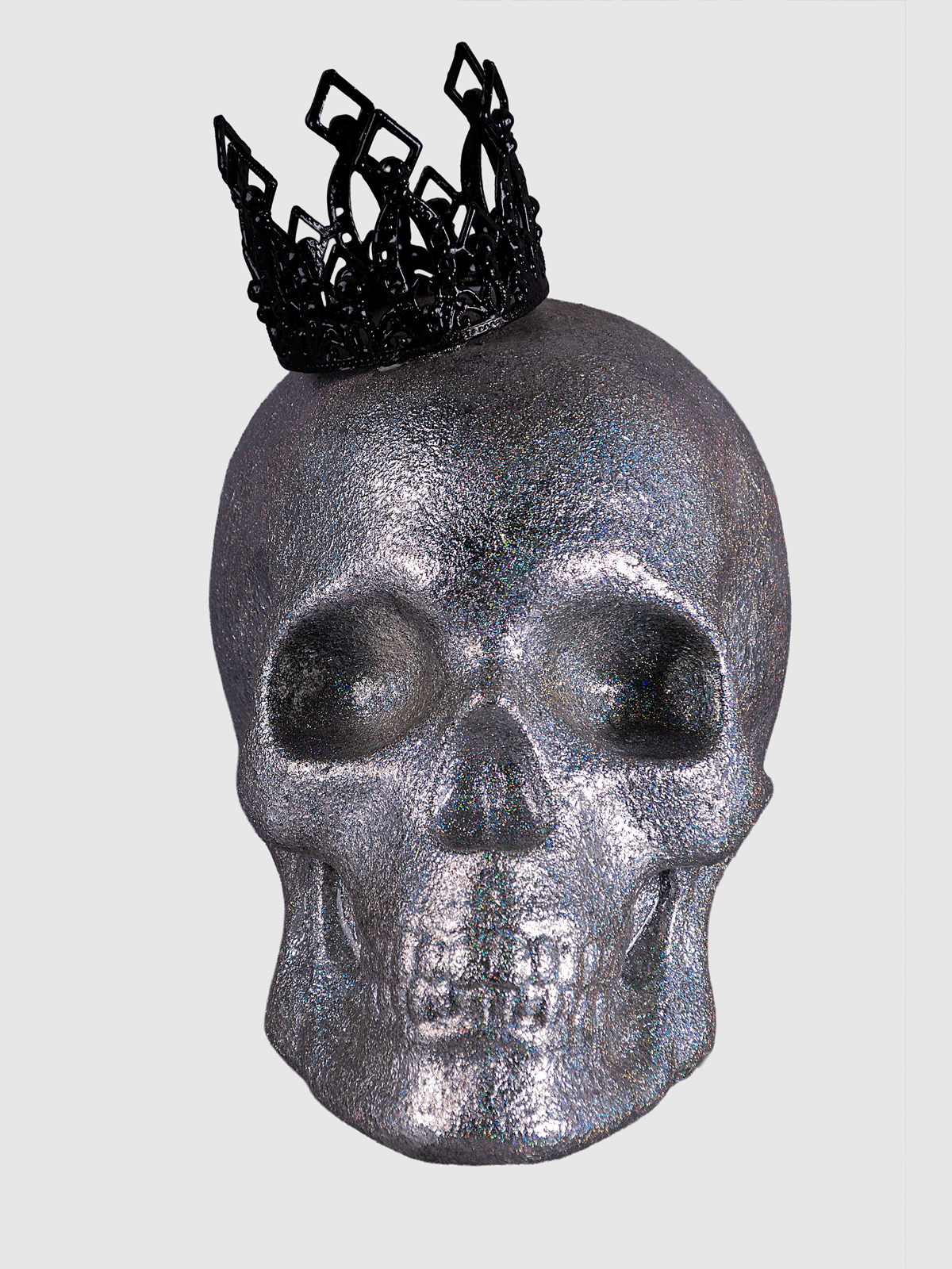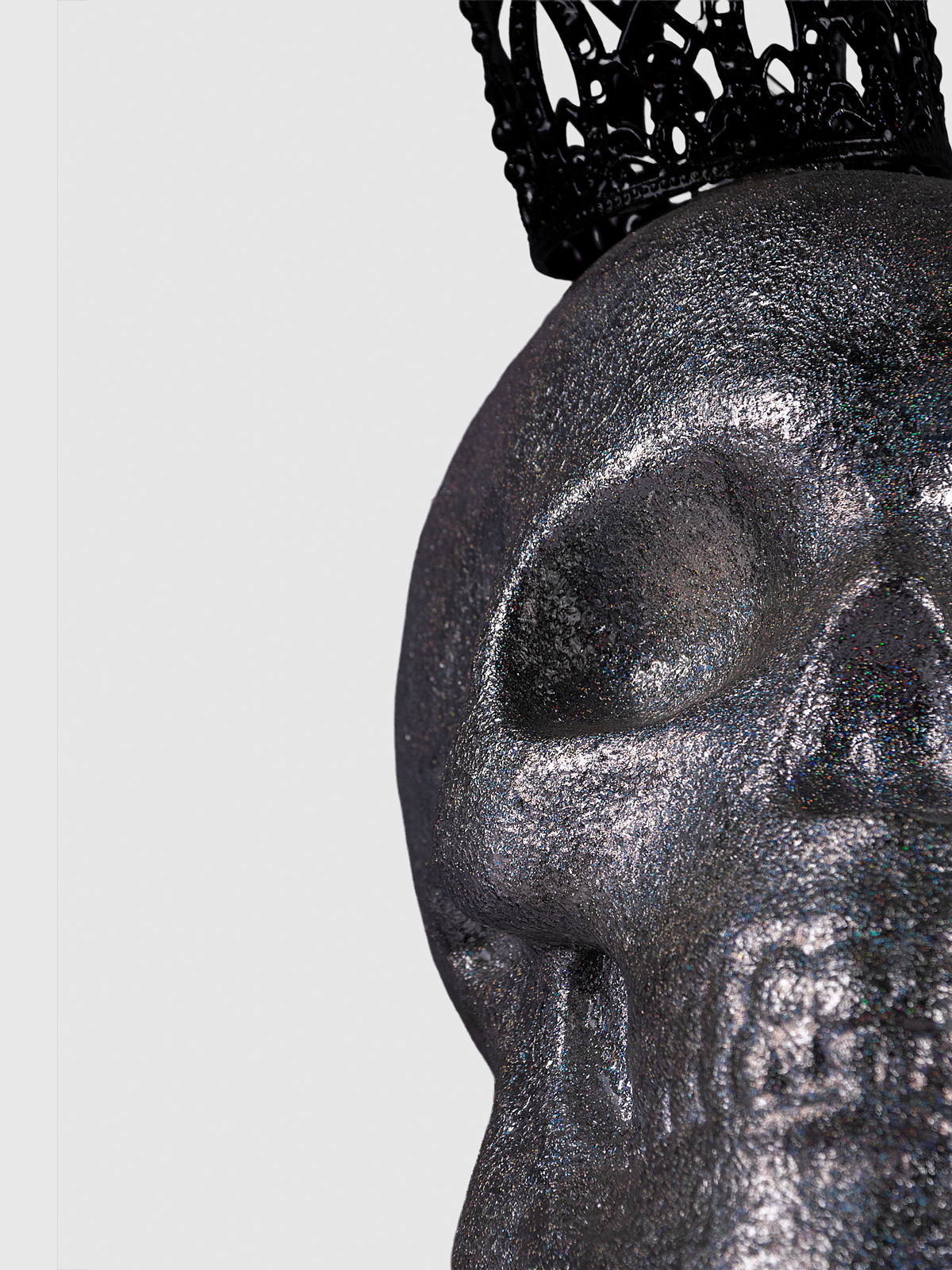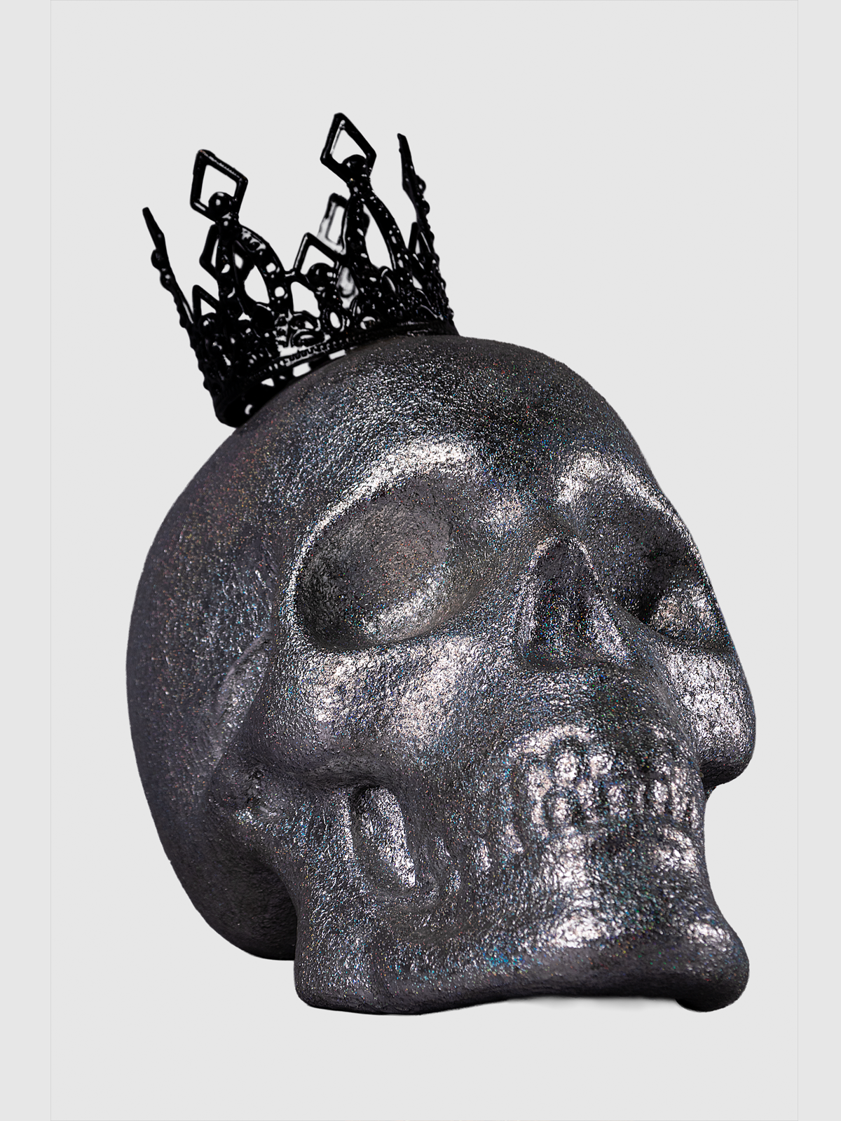 Escultura de craneo y corona “REINA DE NADA”, combina minimalismo oscuro, simbolismo y estética urbana, introduce un contraste conceptual poderoso: la dualidad entre vida y muerte, poder y fragilidad.